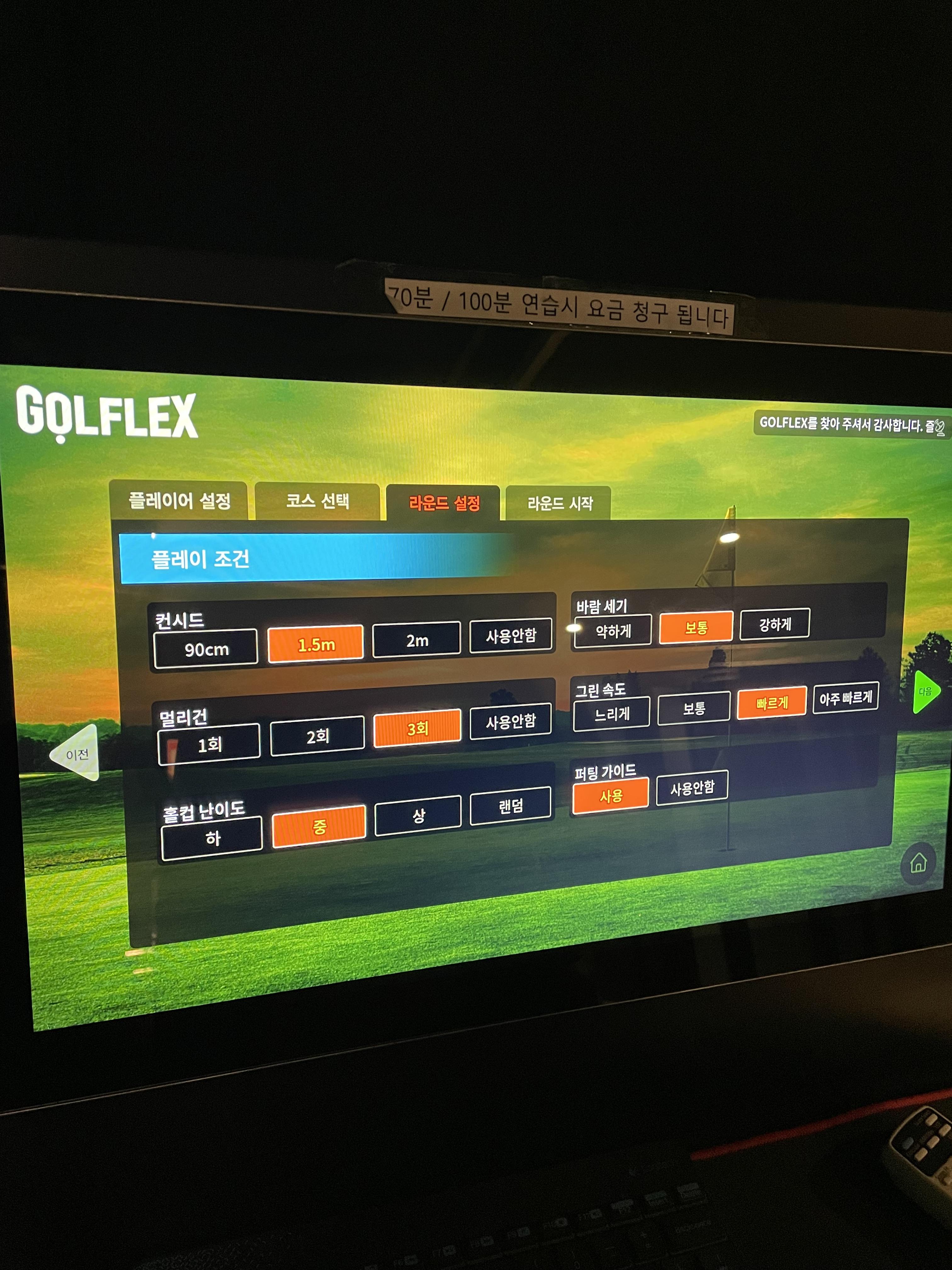회전하는 바닥이 페어웨이, 러프, 벙커 순으로 돌아가면서 세팅이 되고 볼은 티가 올라오는 곳에서 옮겨 치면 됩니다. 공간 활용 등등이 장점일 수는 있겠으나 두 클럽 이상 등 여러 가지 경우에는 어떻게 컵 수 계산을 하는지 잘 모르겠고 다양한 라이를 실현하는데에선 바닥이 고정되어 있는 구조적 한계로 필드상황을 가깝게 재현하지는 못합니다. 그리고 이 골프렉스라는 프로그램이 출시한지 얼마나 되었는지는 잘 모르겠으나 약간의 오류가 있고 특히 퍼팅 시 볼을 잘 읽지 못하는 에러가 계속 발생하는데 나중에 생각해 보니 제가 가지고 있는 캘러웨이 투볼퍼터를 볼과 헷갈려하는 것처럼 느껴졌습니다.